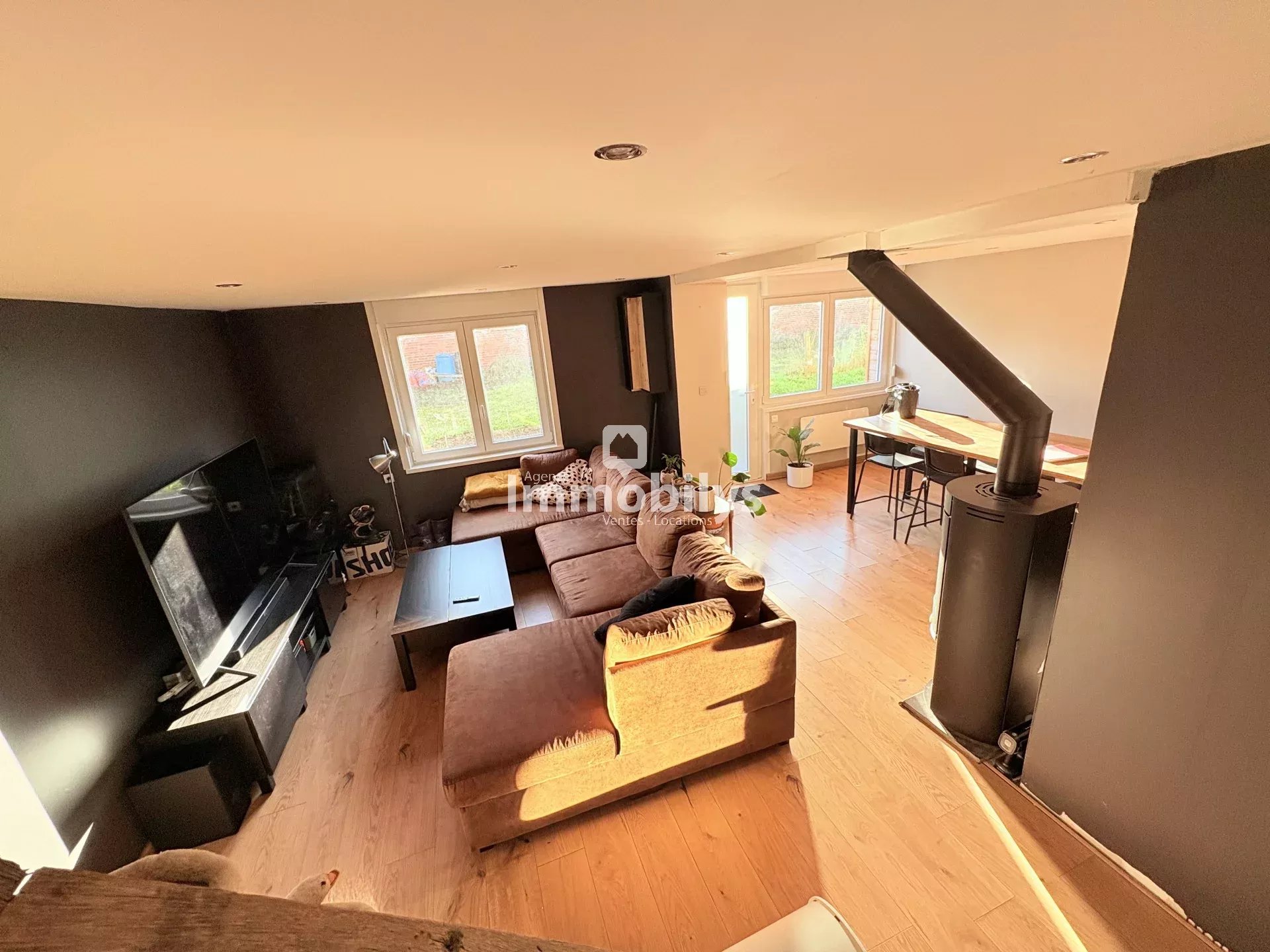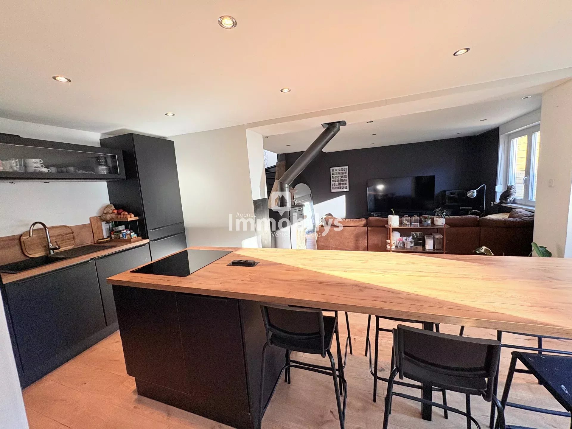 Le rez-de-chaussée bénéficie de menuiseries récentes et d’une pièce de vie agréable comprenant une cuisine équipée ouverte sur le salon, lui-même doté d’un poêle à bois pour un chauffage économique et chaleureux.