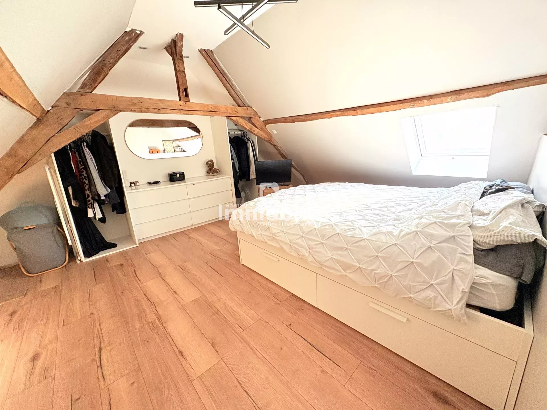 À l’étage, une grande chambre lumineuse ainsi qu’un vaste palier pouvant facilement être transformé en deuxième chambre par la création d’une cloison.